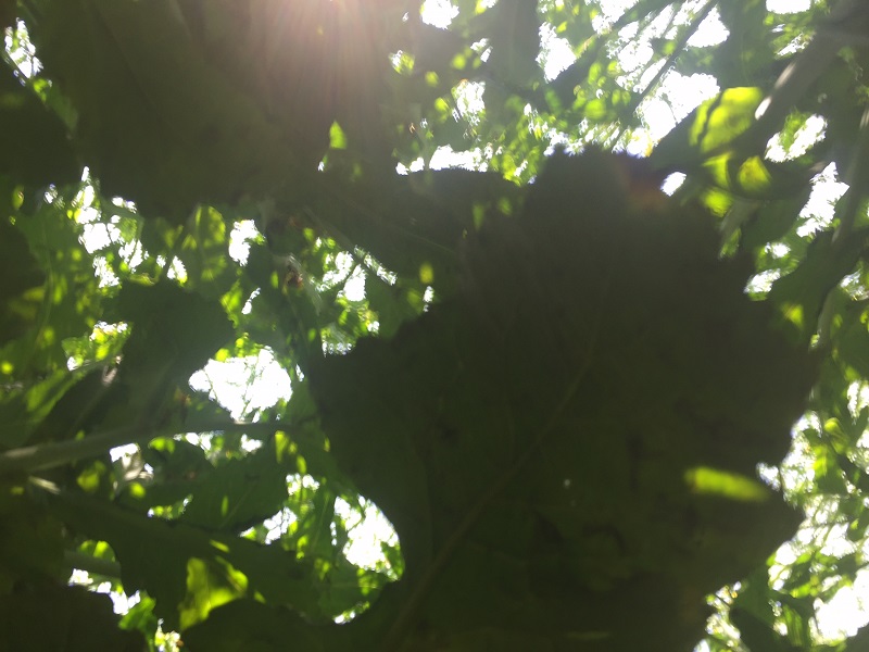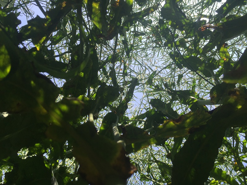 The difference between conventional varieties (left) and hybrids become clear when you lie under the canopy and look up – there’s more light penetration to the lower branches of the hybrid due to a lower plant population.